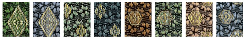 柄に黒を効果的に使用することで、それぞれの柄が浮き上がったように見えるのが特徴です。